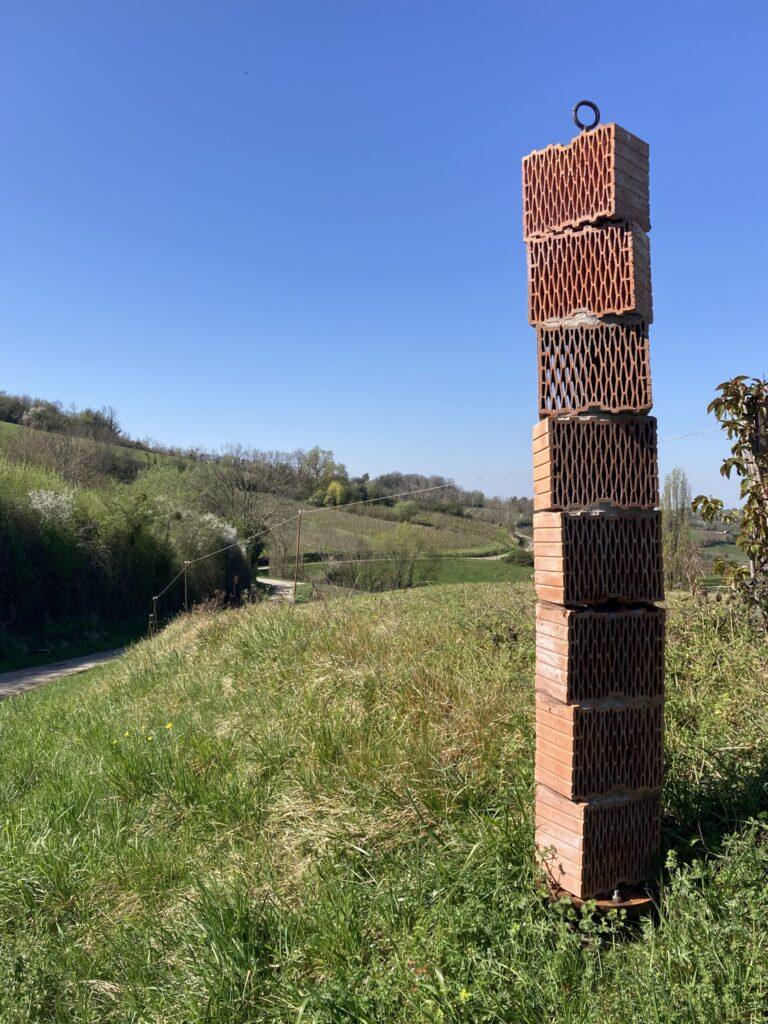 Colonne de briques alvéolaires pour accueillir les abeilles sauvages ou les Aphidius : Petites guêpes parasites du puceron utilisées dans la lutte biologique.