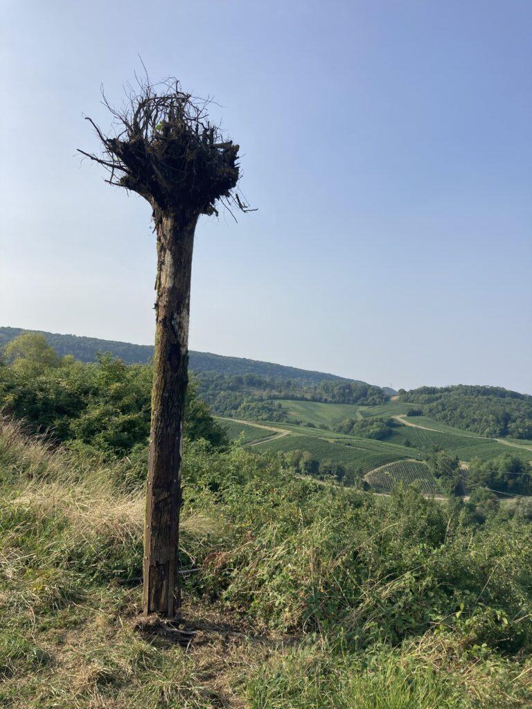 Nichoir fixé dans un grume de chêne coupé en 2.